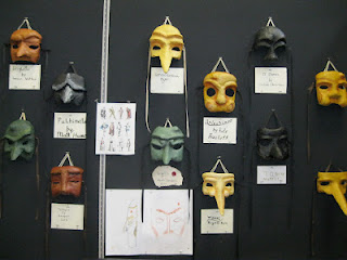 The Commedia dell’Arte began as improvisational street theatre for the common people in Italy in the early 16th century. It quickly spread in popularity all over Europe, and has evolved over the centuries to include a set of archetypal characters which have laid the foundations for modern comedy and theatre today. Many of the popular plot lines which began in commedia dell’arte have been used by writers such as Shakespeare & Moliere. Characters have appeared in operas and ballet compositions by Mozart and Stravinsky, to name a few. SLOCA students even found some modern examples of characters, including Gilderoy Lockhart from Harry Potter (Il Capitano), Han Solo from Star Wars (Brighella), and Harpo Marx of the Marx Brothers (Arlecchino)!Our mask project started with a stock “blank face” papier-mache mask, on which SLO 5th and 6th graders began to sketch. Facial features were based upon the particular emotional expressions typically seen in their chosen character. They then modified eye shapes and added prosthetic noses made of cardboard from a cereal box, applied with glue and papier-mache. Next, they fleshed-out the eyebrows, noses and other features with Sculptamold sculpting medium, a commercial lightweight paperpulp-plaster mix. For fine finishing and smoothing, they used fine dental plaster (and lots of sanding!). Then they applied gesso and paint, antiquing the features with shadows and highlights. Lastly, some students added hair mustaches and eyebrows for added texture. Then we put them on and acted silly!