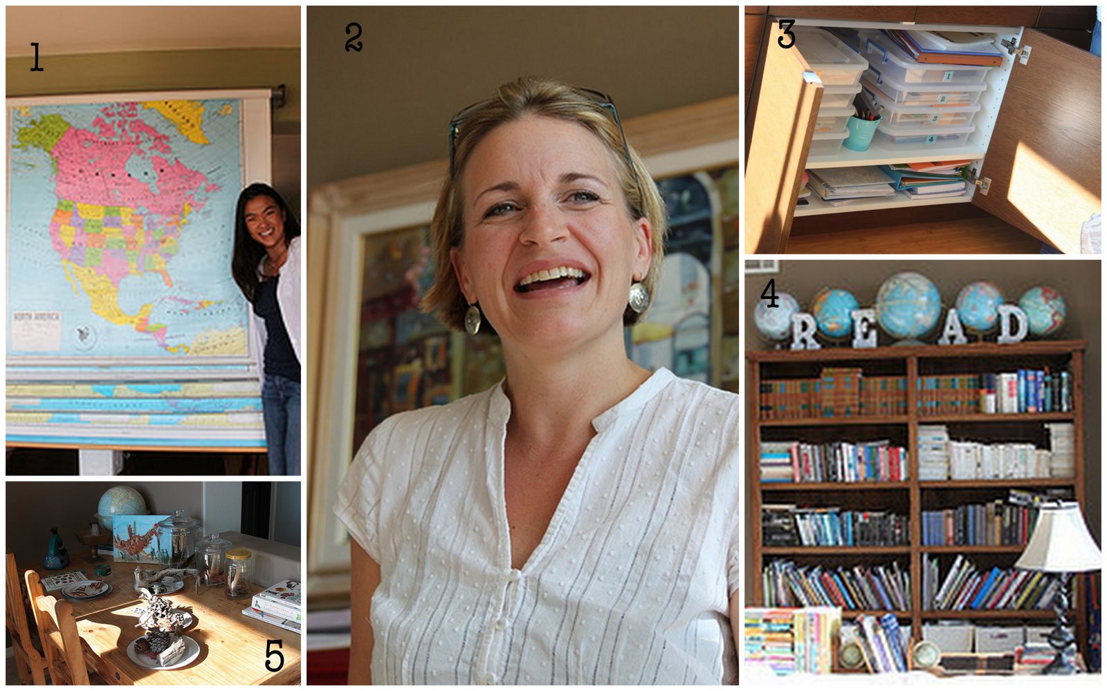 Joy doesn’t have a dedicated schoolroom, so most school work happens at the long kitchen table. She has lots of great storage on one wall in her kitchen with cabinetry from Ikea. Her work box system uses flatter boxes that fit in the existing cabinets. Touches throughout the house like a pull down map, globes and a nature table in the living room allow her family to spread out when needed.