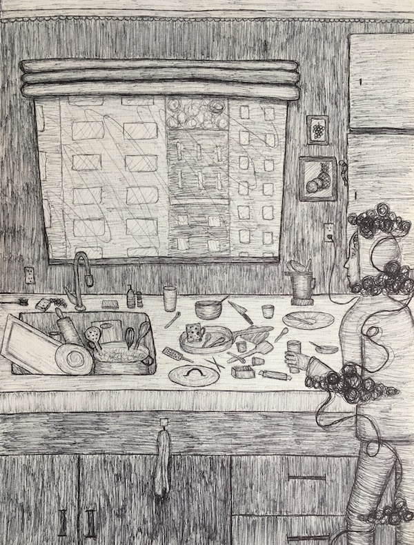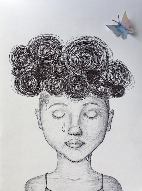 At the beginning of the book, we meet the central character in a deep state of overwhelm, depicted in a gloomy, chaotic, urban setting. I created the images in these early stages of the story with dark colors, drawn in pen with static, confining lines to emphasize emotional confinement. As the story progresses, my character begins to express herself through painting, using self portraiture to show her overwhelming feelings. Gradually I introduce watercolor collage to evoke the freedom that begins to emerge as she breaks free from the clouds that have shadowed her mind. The new views of the city are now illustrated in bright color, the harsh lines retreating, in reflection of her inner state, which evolves towards liberation and self expression. This book became a personal representation of my own experience and highlights the importance of self expression in releasing ourselves from the stressful demands of the world as it is.