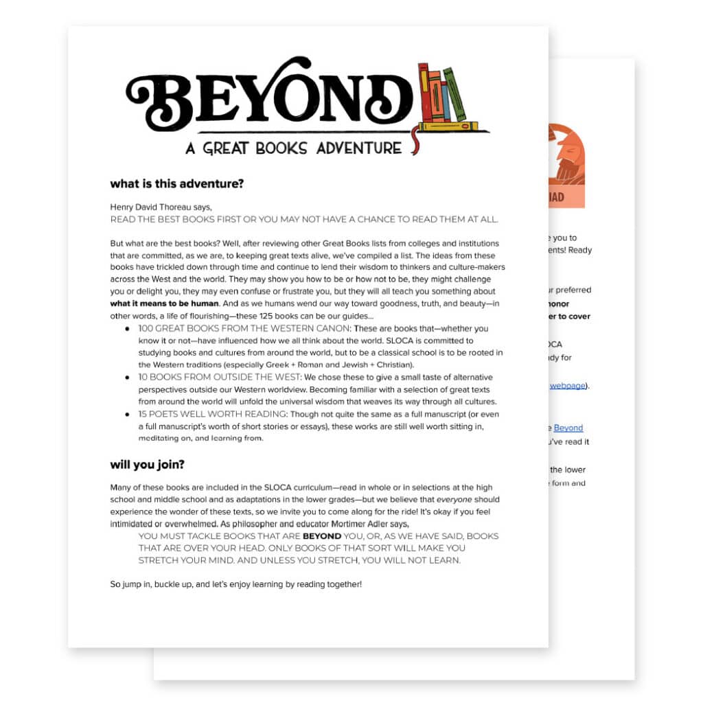 As a classical school, SLOCA is serious about great books—texts that have stood the test of time, whose ideas have trickled down into our current culture and continue to lend their wisdom to thinkers across the West and the world. Many of these great books are included in the SLOCA curriculum—read in whole or in selections at the high school and middle school and as adaptations in the lower grades—but we believe that everyone should experience the wonder of these texts, so we invite you to come along for the ride! These books may show you how to be or how not to be, they might challenge you or delight you, they may even confuse or frustrate you, but they will all teach you something about what it means to be human. And as we humans wend our way toward goodness, truth, and beauty—in other words, a life of flourishing—these 125 books can be our guides!